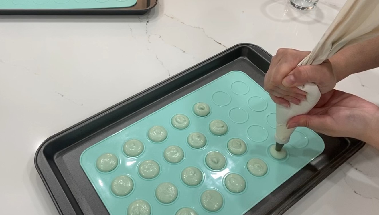 - Transfer batter to a pastry bag and pipe round shapes using a plain round tip. You can pipe on a silicone macarons sheet or on a parchment-lined baking sheet 1 inch apart.